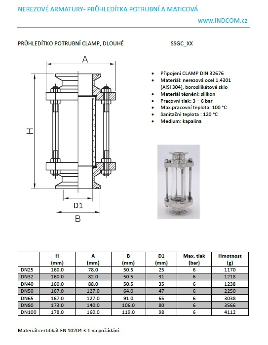 Caractéristique d’un indicateur de circulation en inox, raccordement: CLAMP, long, (pour tuyauterie)