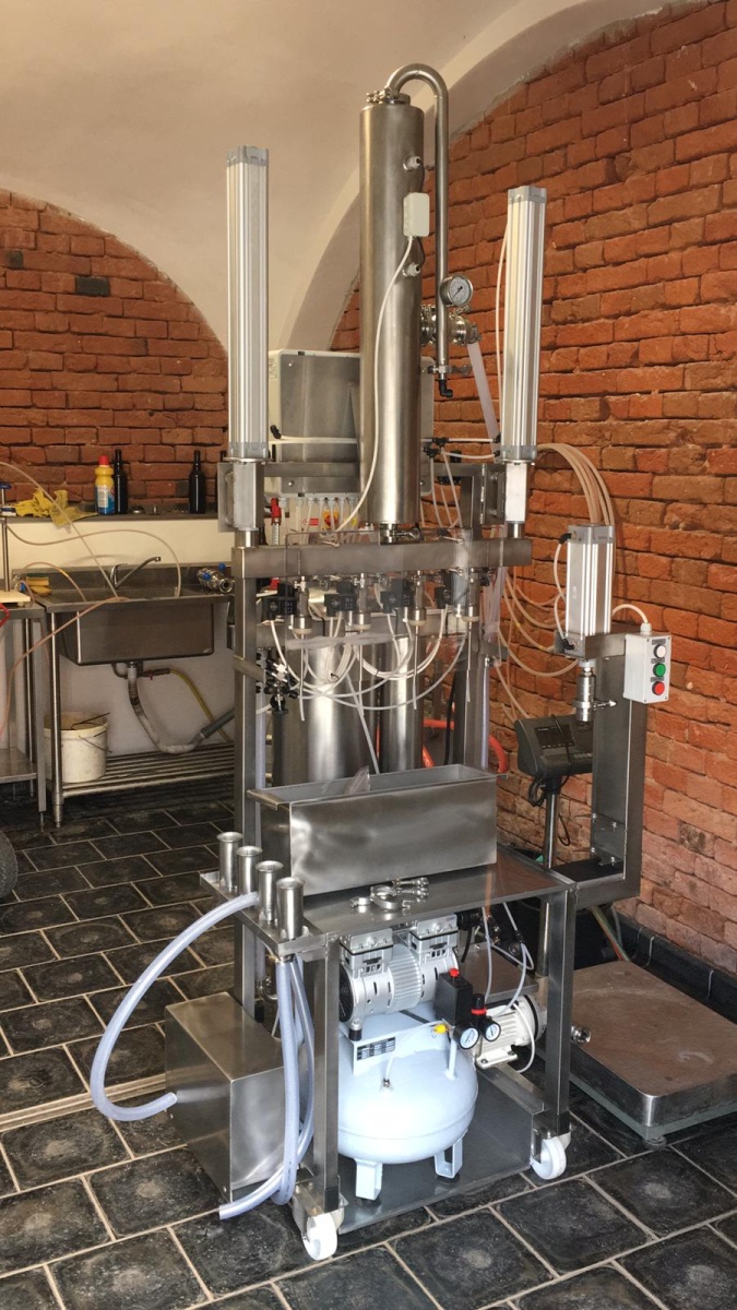 - Dans l'étape suivante à nouveau en appuyant sur un bouton «remplissage», les aiguilles descendent automatiquement et atterrissent sur les cols des bouteilles. Si la ligne d'embouteillage fonctionne correctement, l'opérateur a toujours atteint le même niveau de boisson dans toutes les bouteilles remplies, ce qui est réalisé par une conception spéciale des aiguilles de remplissage.