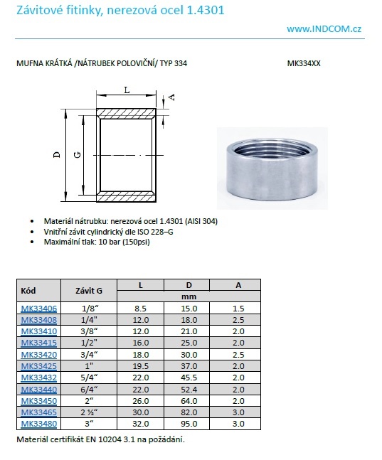 Manchon inox égal femelle court, type 334