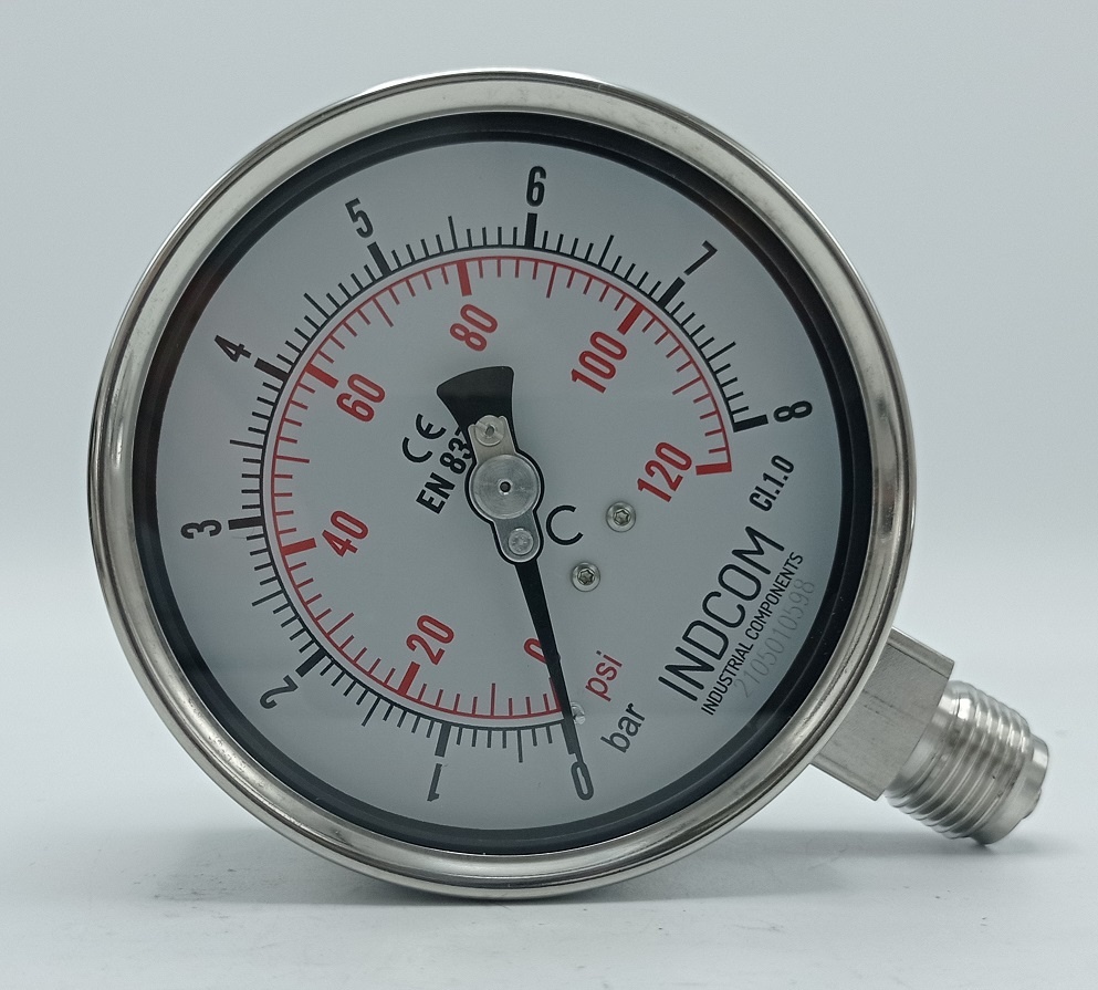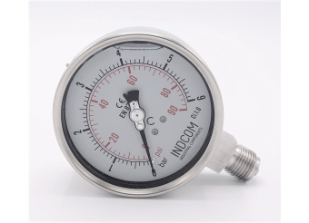 - Manomètre de pression est fabriqué en acier inoxydable matériau du boîtier: acier inoxydable AISI 304, matériau du fil AISI 316. Le dispositif de détection est un Bourdon ressort en acier inoxydable.