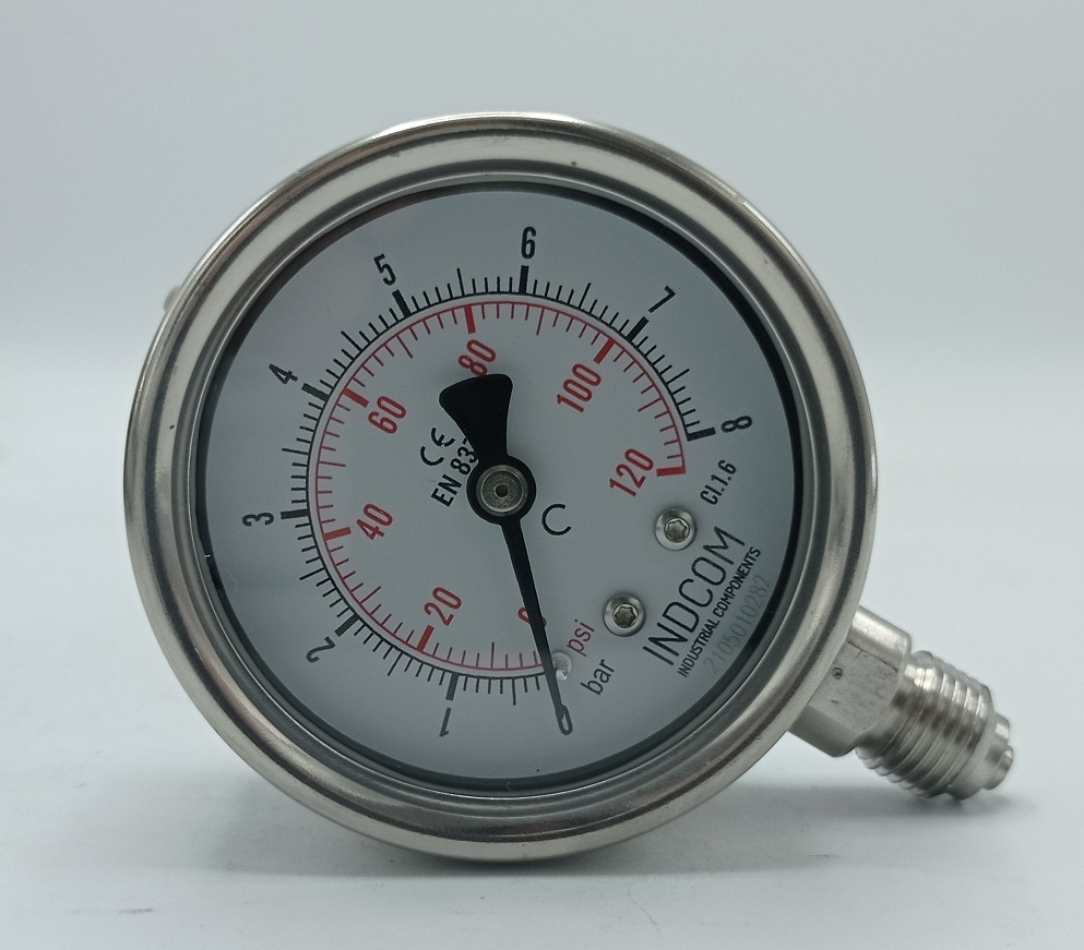 - Manomètre de pression est fabriqué en acier inoxydable matériau du boîtier: acier inoxydable AISI 304, matériau du fil AISI 316. Le dispositif de détection est un Bourdon ressort en acier inoxydable.
