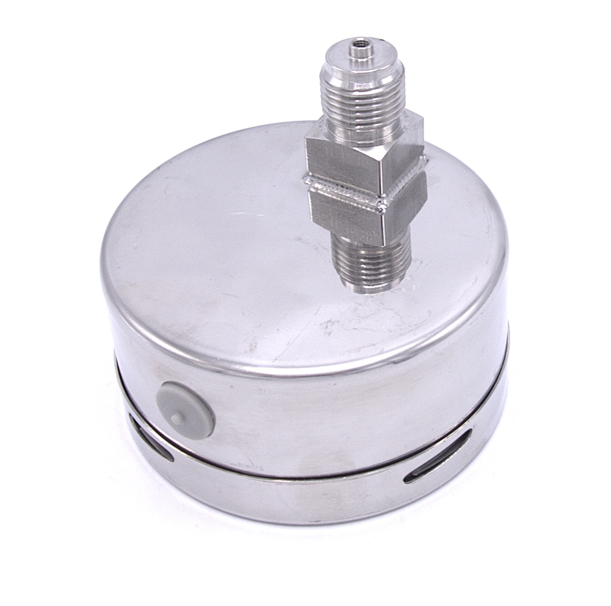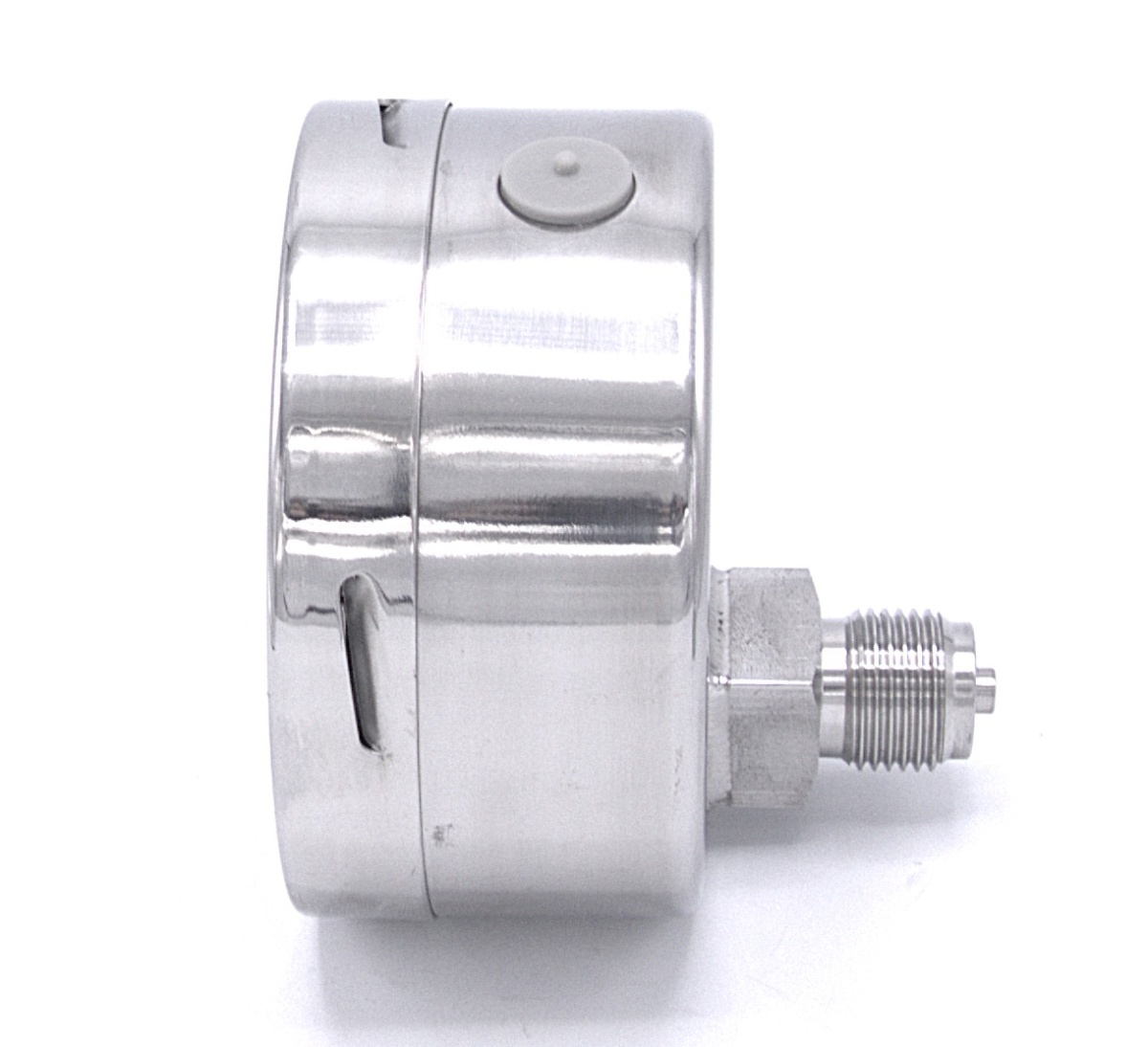 Ce produit entièrement en acier inoxydable garantit une précision, une fiabilité et une protection constantes contre la corrosion chimique. Matériau du boîtier 1.4301 (AISI 304), matériau du filetage 1.4401 (AISI 316). Le dispositif de détection est un ressort en acier inoxydable Bourdon. Le connecteur est soudé par la méthode TIG. Les manomètres sont livrés en standard avec un remplissage glycériné (protection contre les chocs de fonctionnement).
