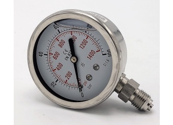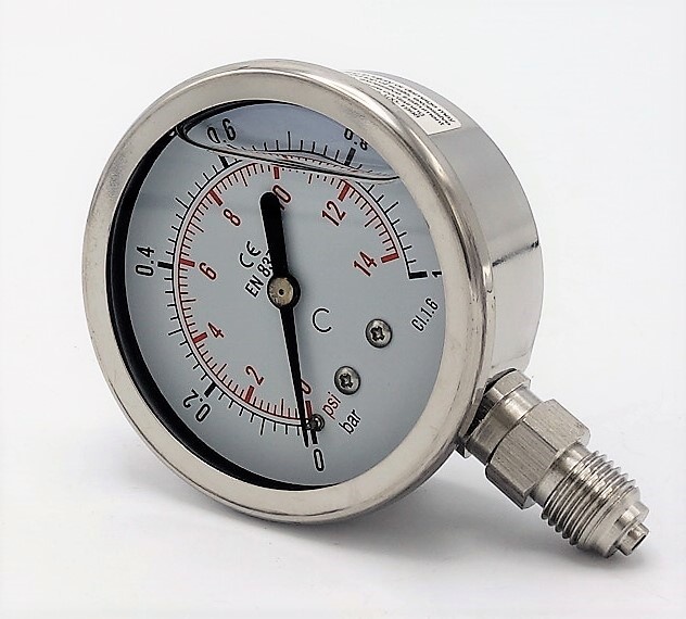 - Manomètre de pression est fabriqué en acier inoxydable matériau du boîtier: acier inoxydable AISI 304, matériau du fil AISI 316. Le dispositif de détection est un Bourdon ressort en acier inoxydable.