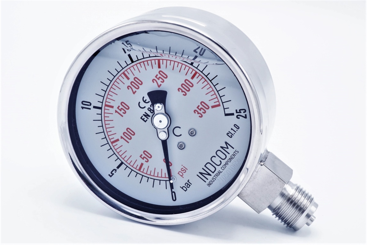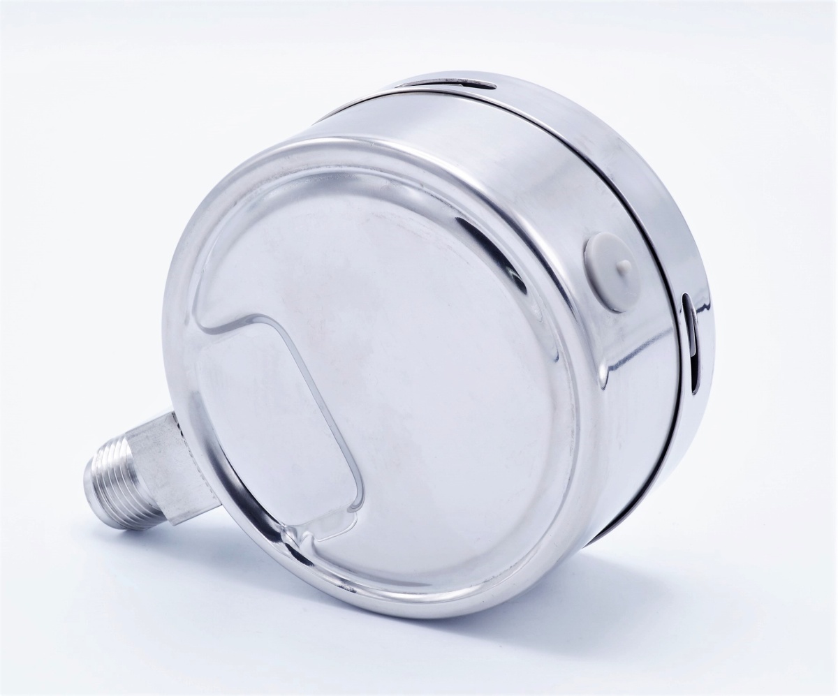 - Manomètre de pression est fabriqué en acier inoxydable matériau du boîtier: acier inoxydable AISI 304, matériau du fil AISI 316. Le dispositif de détection est un Bourdon ressort en acier inoxydable.