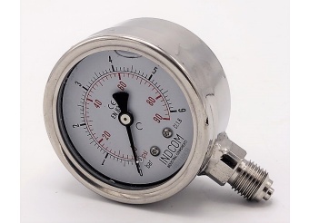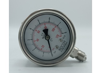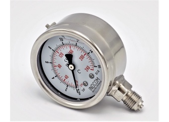 - Manomètre de pression est fabriqué en acier inoxydable matériau du boîtier: acier inoxydable AISI 304, matériau du fil AISI 316. Le dispositif de détection est un Bourdon ressort en acier inoxydable.