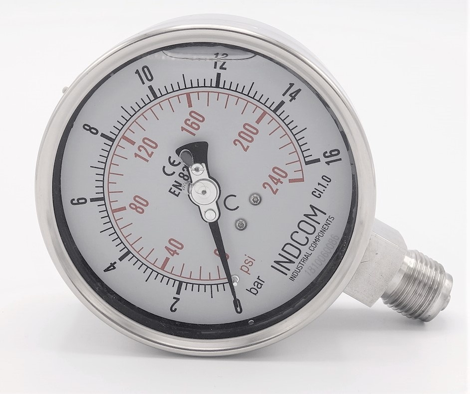 - Manomètre de pression est fabriqué en acier inoxydable matériau du boîtier: acier inoxydable AISI 304, matériau du fil AISI 316. Le dispositif de détection est un Bourdon ressort en acier inoxydable.