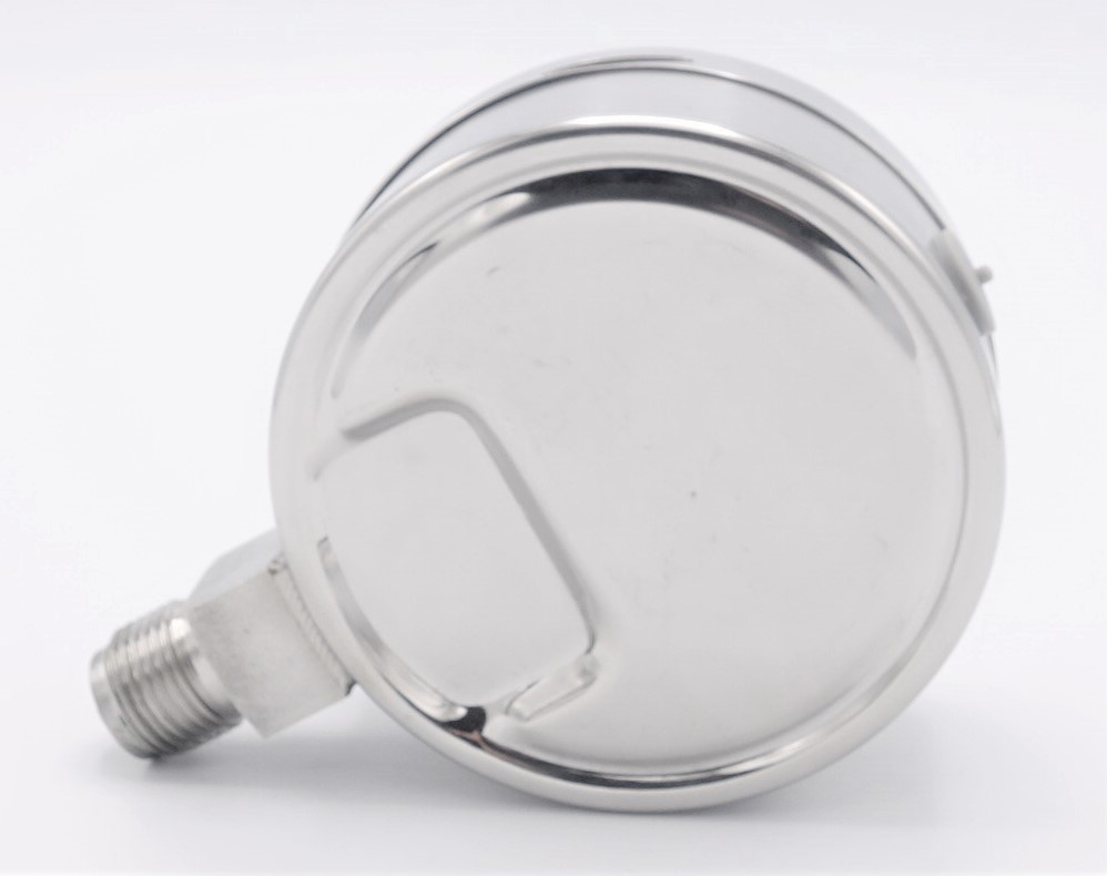 - Manomètre de pression est fabriqué en acier inoxydable matériau du boîtier: acier inoxydable AISI 304, matériau du fil AISI 316. Le dispositif de détection est un Bourdon ressort en acier inoxydable.