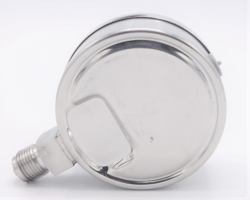 - Manomètre de pression est fabriqué en acier inoxydable matériau du boîtier: acier inoxydable AISI 304, matériau du fil AISI 316. Le dispositif de détection est un Bourdon ressort en acier inoxydable.