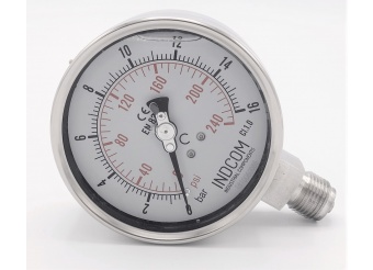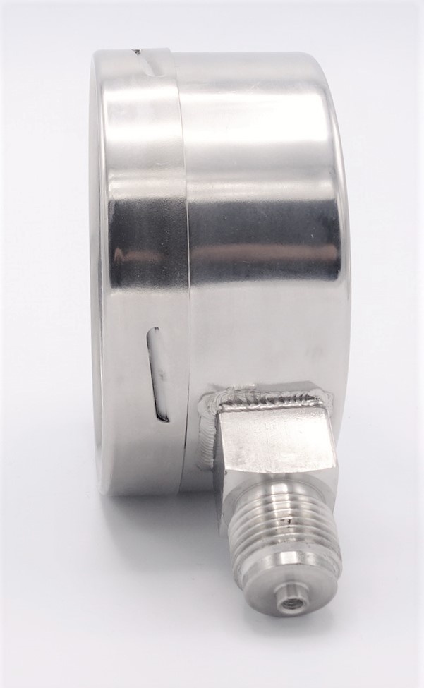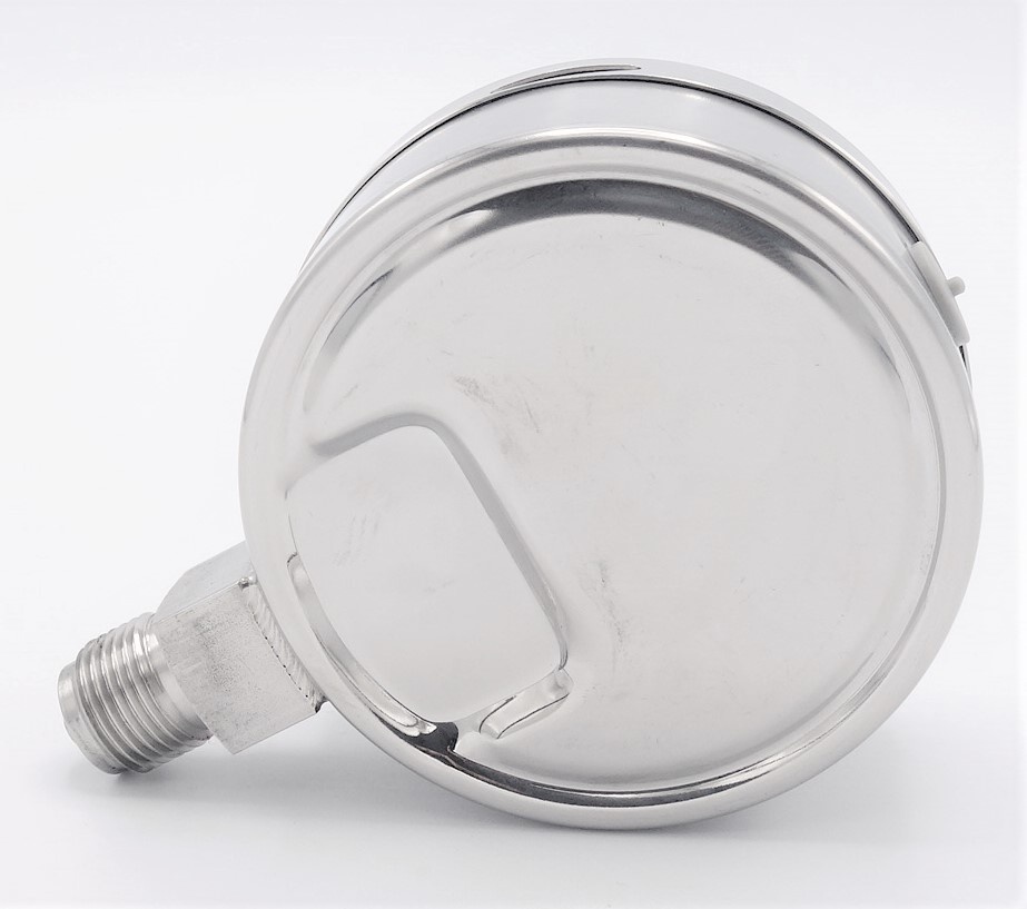 - Manomètre de pression est fabriqué en acier inoxydable matériau du boîtier: acier inoxydable AISI 304, matériau du fil AISI 316. Le dispositif de détection est un Bourdon ressort en acier inoxydable.