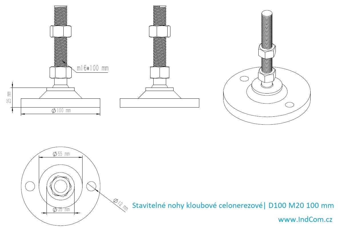 Pieds en acier inoxydable, réglables en hauteur, avec articulation diamètre de pied 100 mm, vis M20, longueur de vis 100 mm