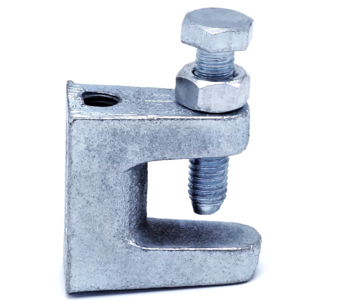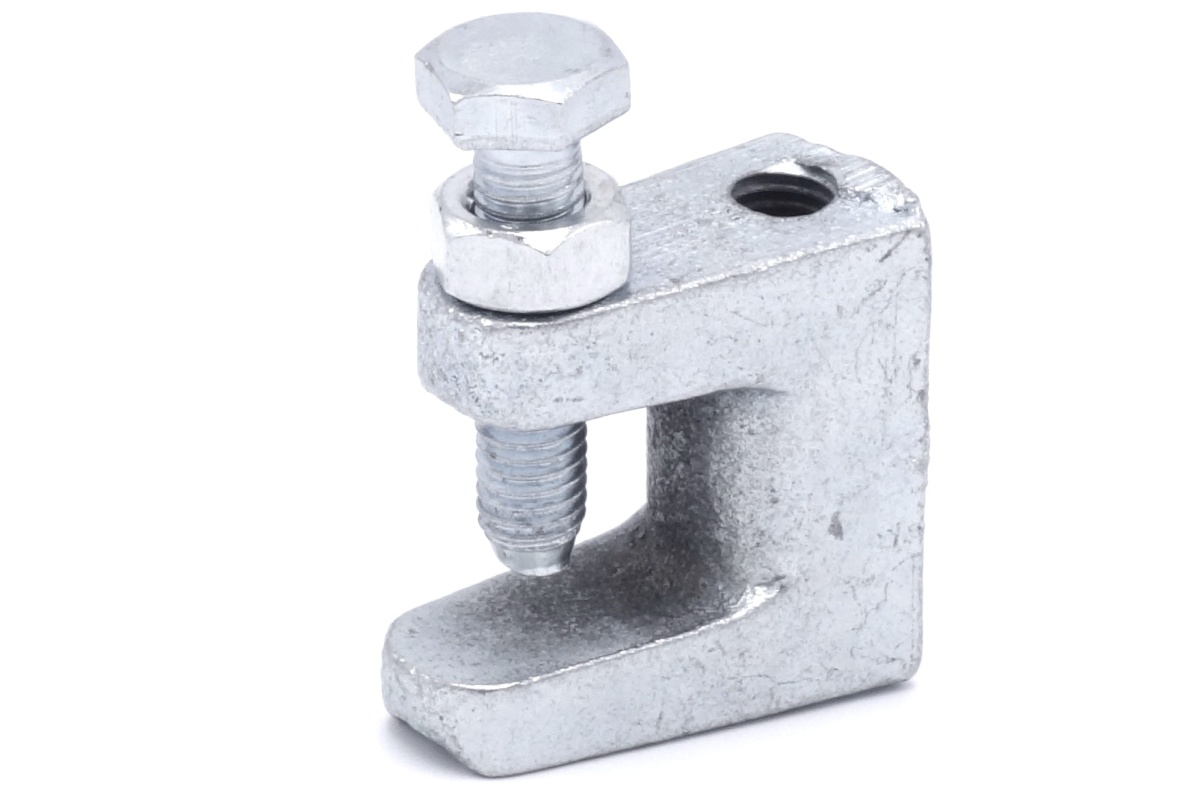 Pince à poutre, galvanisée. Pinces sur poutres pour la fixation de tiges filetées. La pointe de la vis est ajustée de manière à ce qu'il ne soit pas possible de faire glisser la pince hors du profilé.