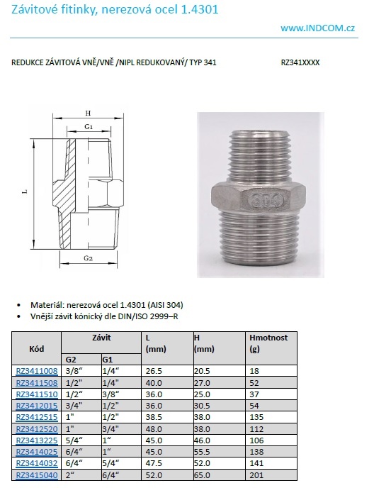 Réduciton VNĚ/VNĚ rype de filetage 341, mamelon avec hex, acier inoxydable 1.4301