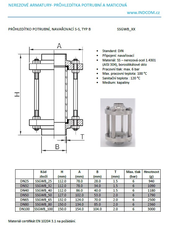 Indicateur de circulation en inox, raccordement: à souder, (pour tuyauterie), type B