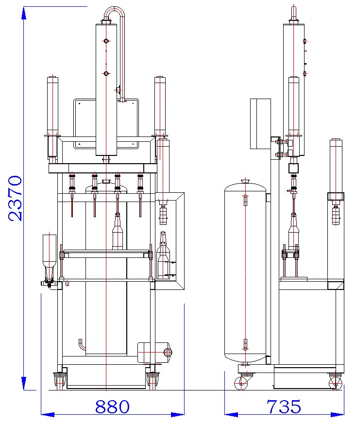 • la ligne dispose de quatre buses d'assainissement, quatre têtes de remplissage avec le remplissage des aiguilles et l'un d'étanchéité de la tête
